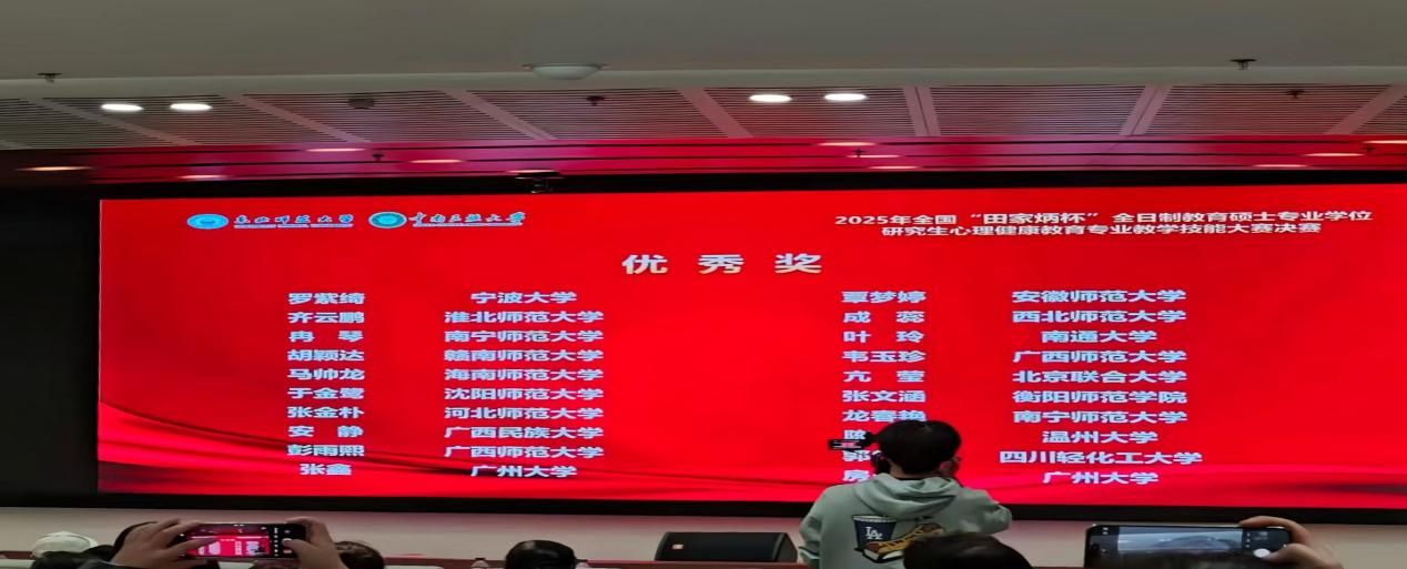 2025年全国“田家炳杯”全日制教育硕士专业学位研究生心理健康教育专业教学技能大赛于10月19日圆满落下帷幕。其中,由唐芳贵副校长、尹洁教授指导的3位参赛研究生均获佳绩:袁熠烽同学获得全国一等奖,田熠同学获得全国三等奖,张文涵同学获得全国优秀教学设计奖,实现了该竞赛一等奖的突破。