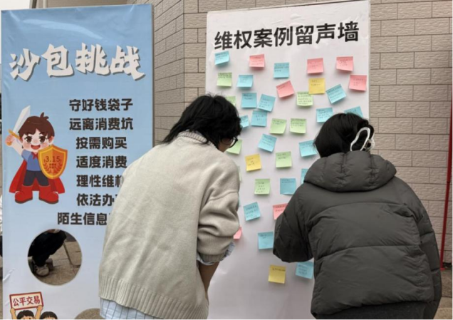 线下活动于3月15日上午九点在新食堂前坪正式开展。现场设置了 “维权知识问答”、“护权沙包挑战赛”以及“维权案例留声墙” 三大特色区域。现场气氛热烈,同学们在趣味问答中巩固消费法律知识,提升维权能力;通过投掷沙包趣味抵制消费陷阱,增强维权主动性;“留声墙”上贴满维权故事与感悟,成为传递法治精神、分享经验的一道风景线。