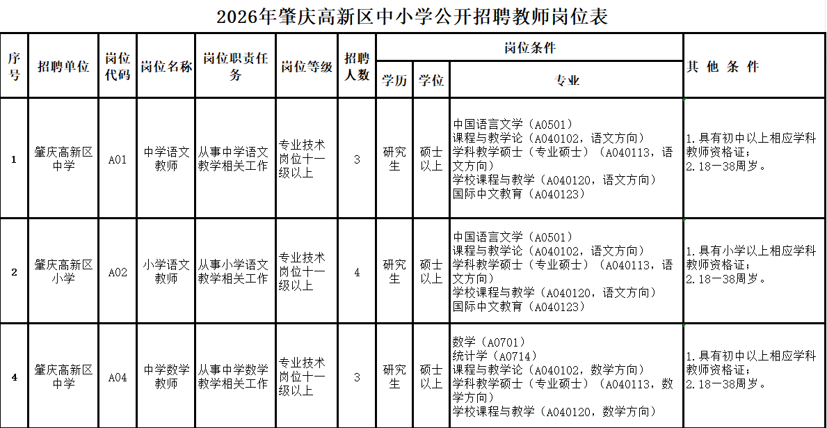 “百万英才汇南粤”——2026年广东省肇庆高新区中小学公开招聘教师公告