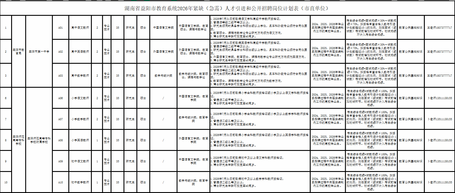 本次公开招聘(引进)事业编制工作人员,具体岗位与要求详见《湖南省益阳市教育系统2026年紧缺(急需)人才引进和公开招聘岗位计划表(市直单位)》