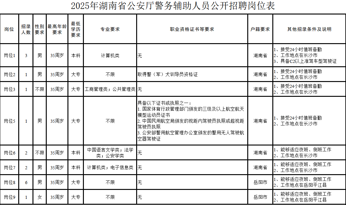 2025年湖南省公安厅警务辅助人员公开招聘公告