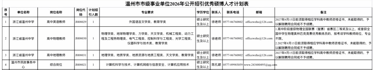 2026年温州市市级事业单位和知名企业公开招引优秀硕博人才公告