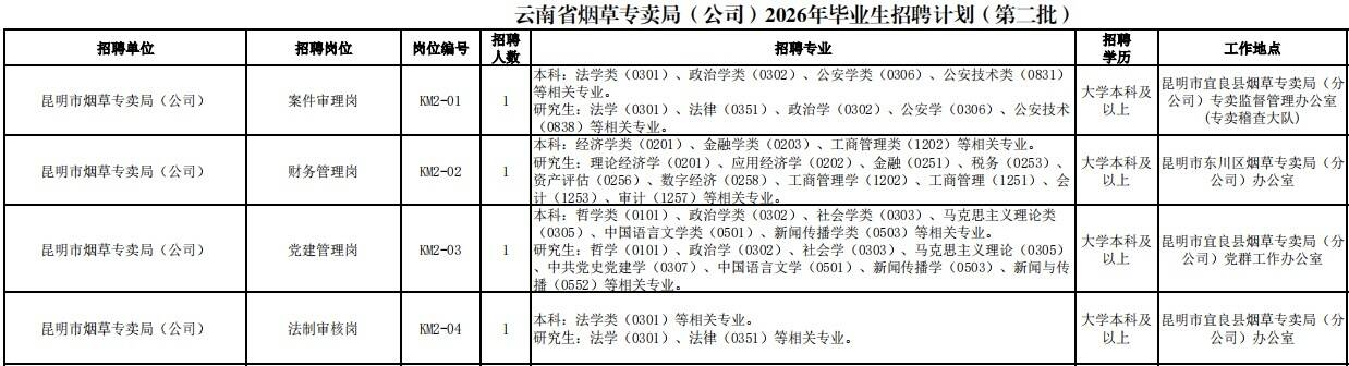 云南省烟草专卖局(公司)2026年毕业生招聘公告(第二批)