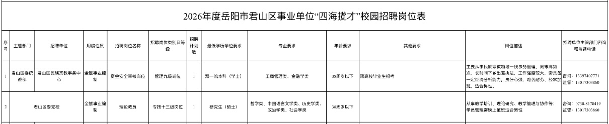 湖南省岳阳市君山区事业单位“四海揽才”校园招聘公告
