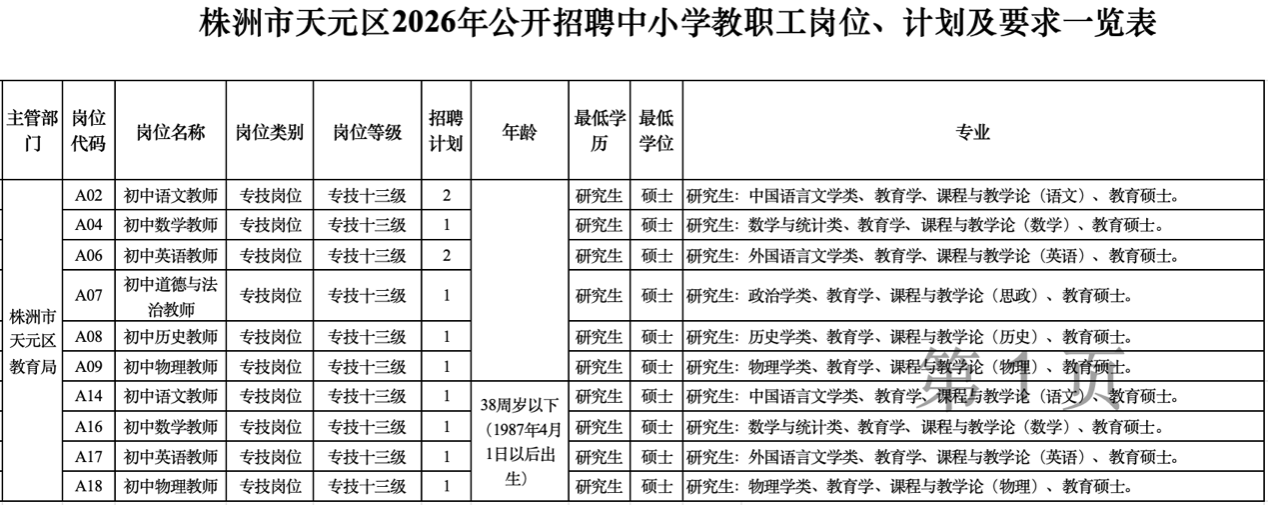 2026年湖南株洲市天元区公开招聘中小学教职工公告